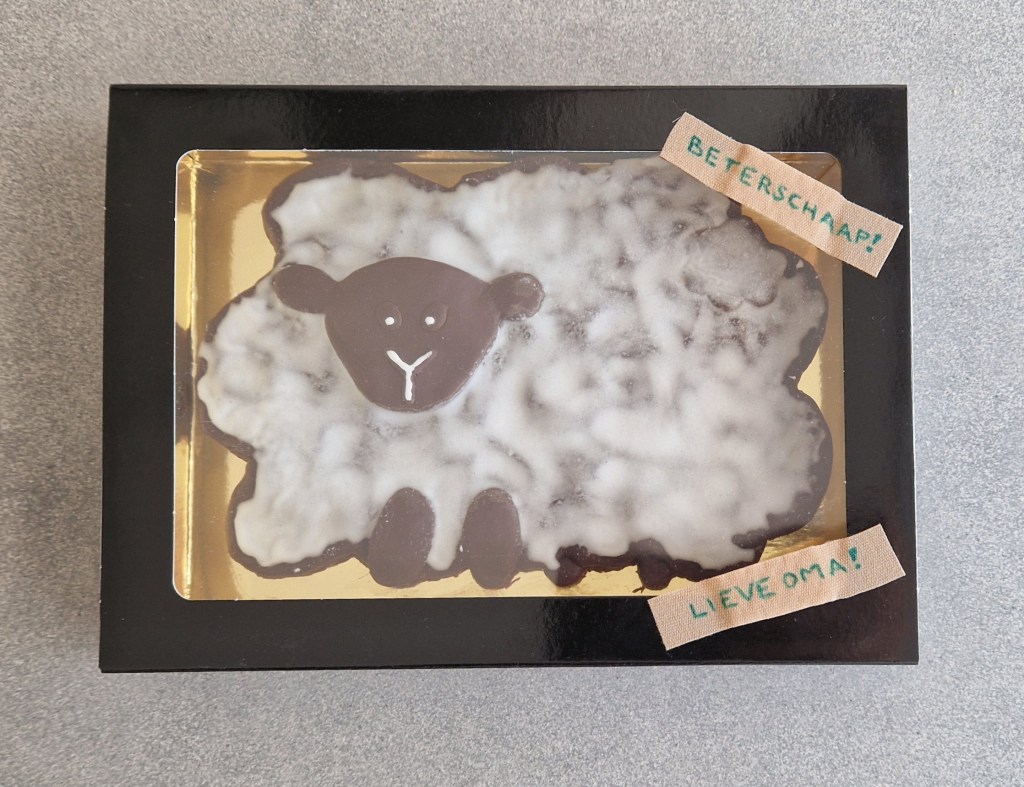 Deze chocoladefiguur is gemaakt van pure chocolade met fondant als wit wollen vachtje. Op de verpakking zijn pleisters geplakt met een persoonlijke tekst. Zowel de tekst als de kleur is te personaliseren. Verder is er de keuze voor een klassieke bruine pleister of een witte pleister.