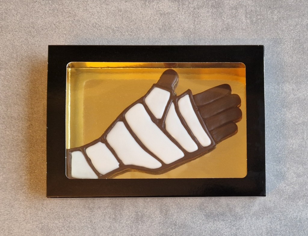 Deze chocoladefiguur is gemaakt van pure chocolade, met witte fondant als gips. Ideaal om te geven aan iemand die opgebeurd kan worden.
